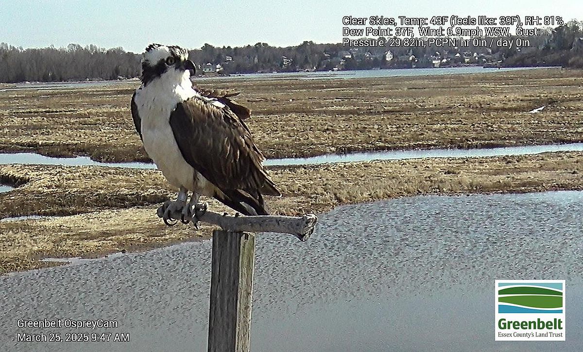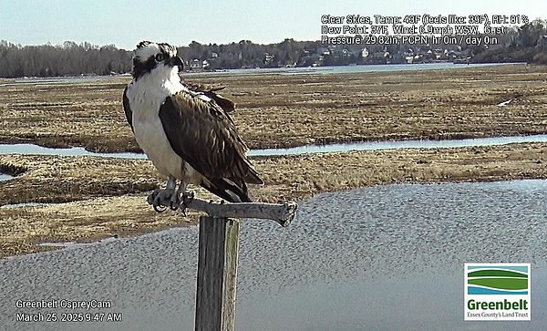 If I had to guess, the unbanded bird seen yesterday is Annie and the banded bird seen yesterday and today is the same male from past years. Only time will tell. What I can say for sure is that Osprey are back in the area now, and on this nest, almost 2 weeks earlier than 2024. Annie has generally showed up first and has had to deal with the intruding banded male until Squam arrives, usually days later. There is no telling what will happen this year but it will all unfold before us in the coming weeks.