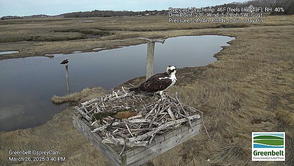 Today, March 26, we are witnessing a repeat of the past 2 years, with Annie returning and being greeting by a banded intruding male Osprey that I assume is the same one from previous years. He started bringing in some nesting materials today, as shown in photo, and just like the past 2 years, what he carried in to build the nest was mostly seaweed and organic materials, not sticks. I know I am repeating myself by speculating on how this will turn out, but Squam has typically arrived after Annie in most years and this year appears the same. I believe this banded male will remain present, trying to act the part of Annie’s mate, but will eventually be pushed away by Squam upon his return. Nothing like a bit of drama to kick off season.