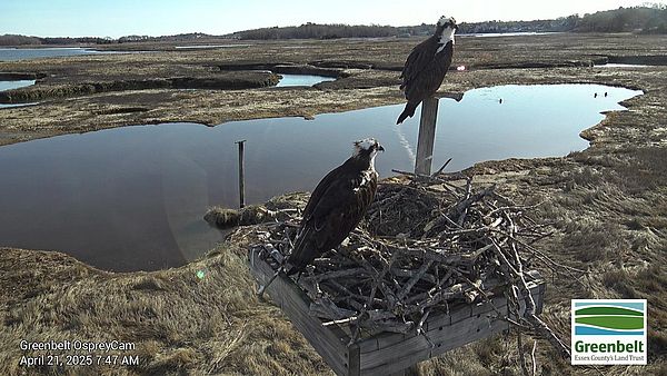 My apologies for the gap in blog entries… I was on vacation and traveling most of last week. I was checking in on Annie and Squam’s activity from afar, and like all of you, what I observed was a lot of nest building activity. Typically Annie lays her first egg in the last week of April. In 2024, the first egg came on April 27. So I believe the nesting season is unfolding in a normal way. For those of you who have been watching the webcam more than me last week and you saw what you thought was some unusual behavior (I did get some feedback commenting on this), I don’t have an explanation. But I am pretty confident that we will all observe a nest with eggs in it over the next 10 days or so. Annie and Squam are certainly present on the nest and the nest cup looks deep and ready for eggs as the photo shows.