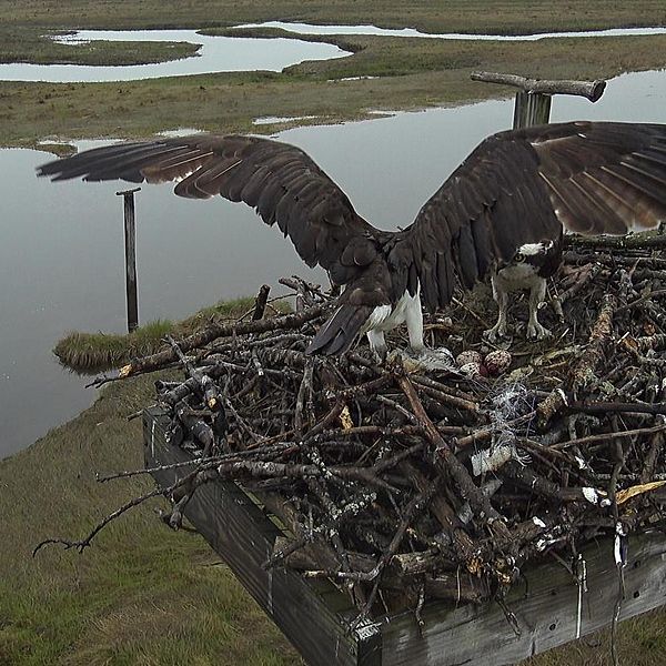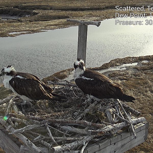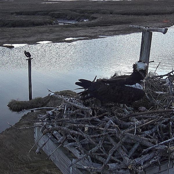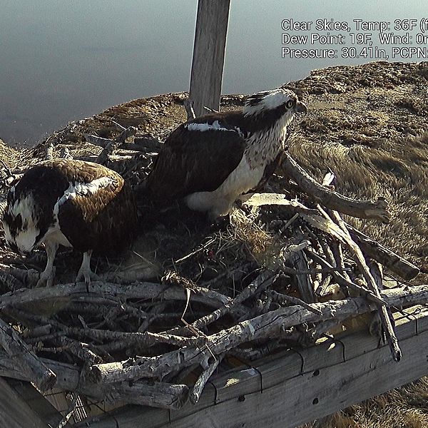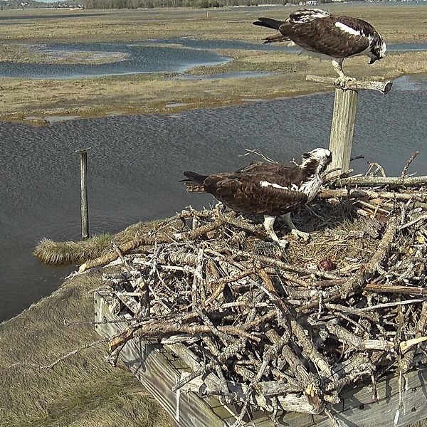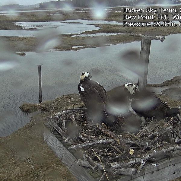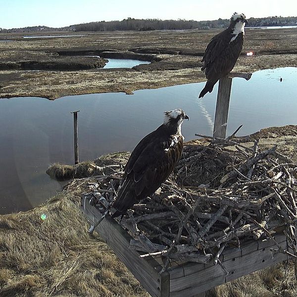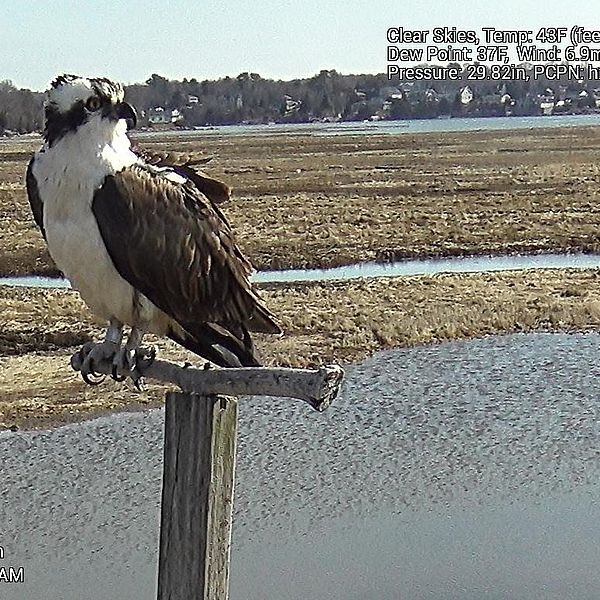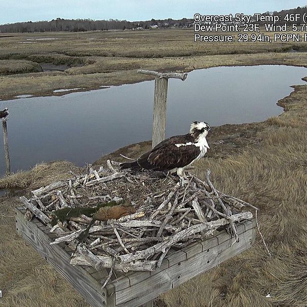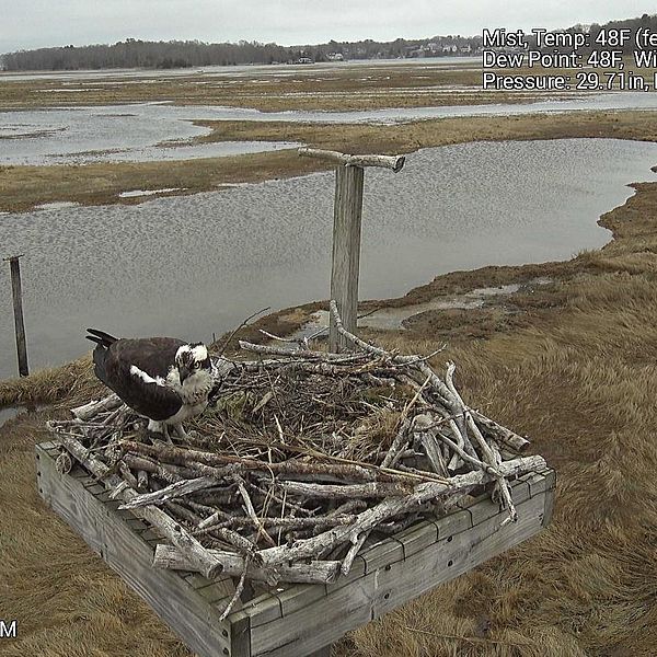 Across the region, Osprey are back on some nests but I believe that many birds are late in returning, perhaps due to the poor weather along the East Coast the last 2-3 weeks. The first 2 weeks of April are when we generally see most nests get reoccupied, so I am confident we will see a big increase in nest activity in the nest 2 weeks. And fingers are crossed that includes the webcam nest with Annie and Squam!