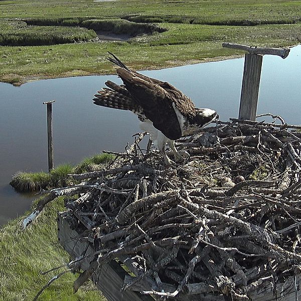 The OspreyCam, installed in 2018, has been streaming each nesting season ever since. Powered by solar energy, it transmits wirelessly to Lobsta Land Restaurant in Gloucester, and from there, out to the world. The stream runs daily from approximatley 6:00am to 6:00pm.