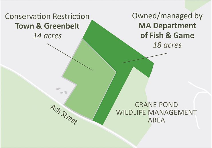 After acquiring the property, Greenbelt sold approximately 18 acres to MassWildlife. This land was incorporated into the adjacent Crane Pond Wildlife Management Area and is now managed as protected habitat. The remaining 18 acres was sold to a private buyer, subject to a conservation restriction covering roughly 14 acres. This restriction, jointly acquired by the Town of West Newbury and Greenbelt, ensures that the land will be permanently preserved from development.