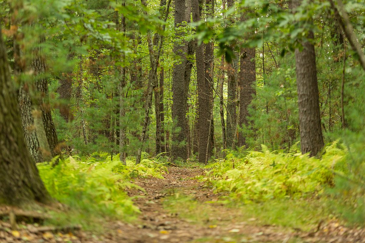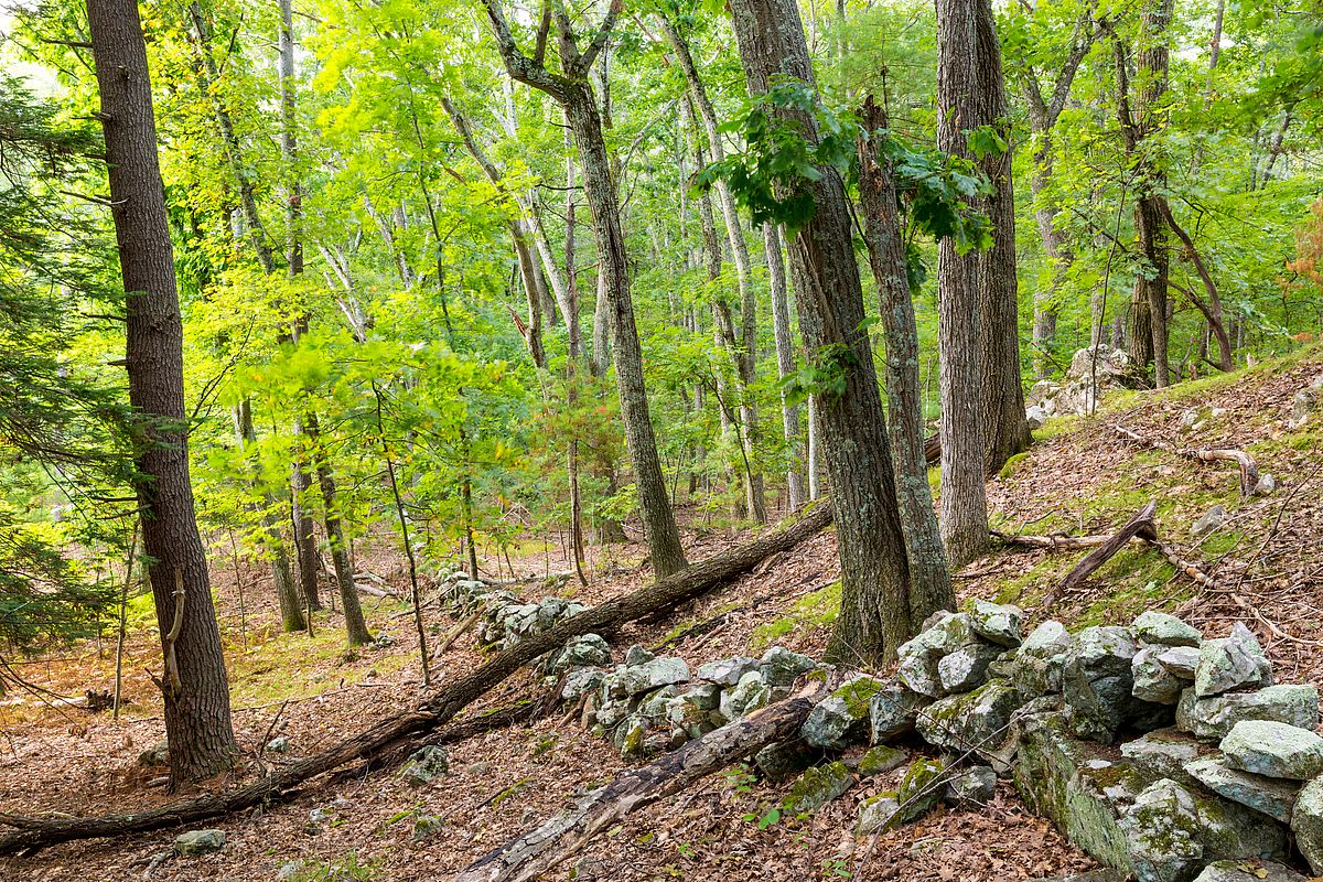 A mixed hardwood forest populated with mature trees, wide trails, and a vast field of ferns awaits. A large beaver pond, wetlands, and old stone walls line trails connecting to adjacent conserved forest and fields.