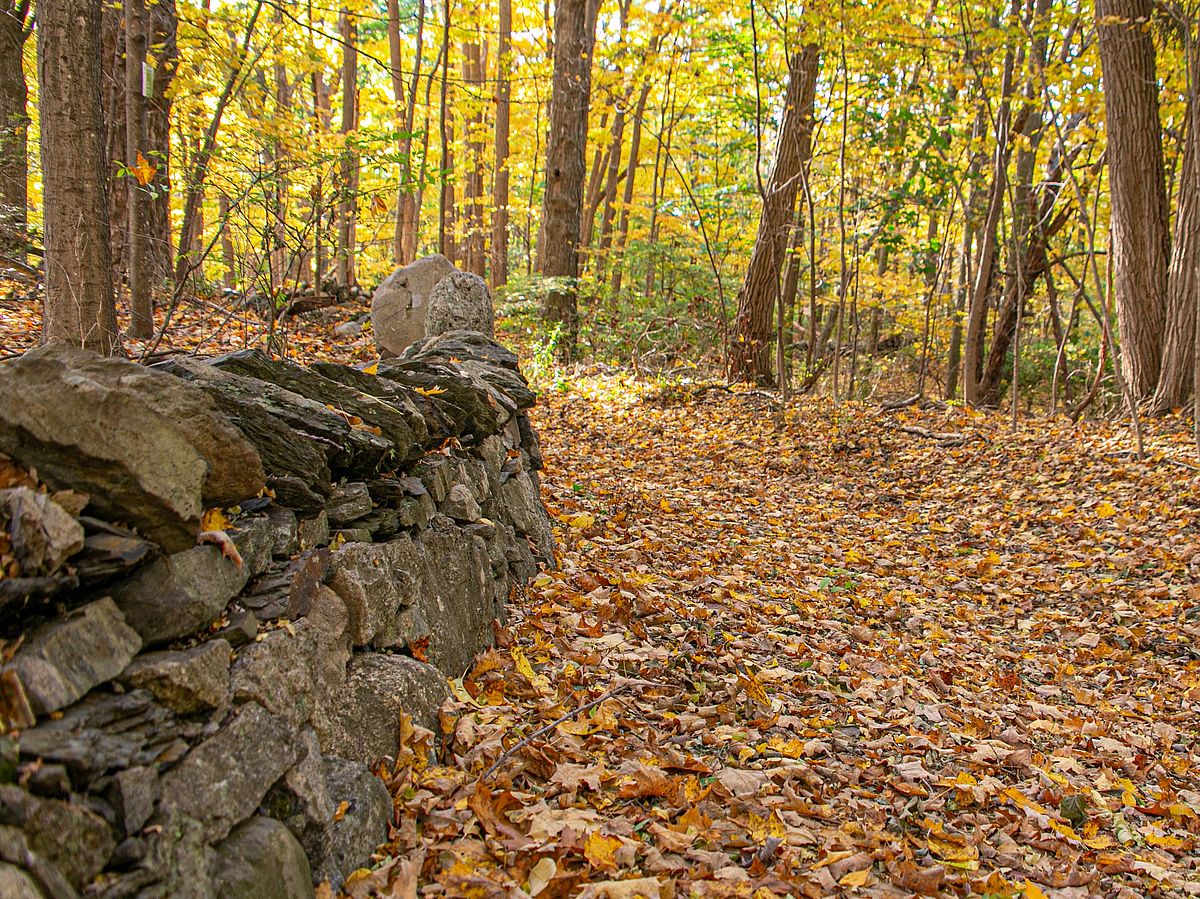 A climb up the hill leads visitors along exceptional dry-stacked stone walls and wide cart paths that meander through the woods and along the edge of the Indian Hill Reservoir.