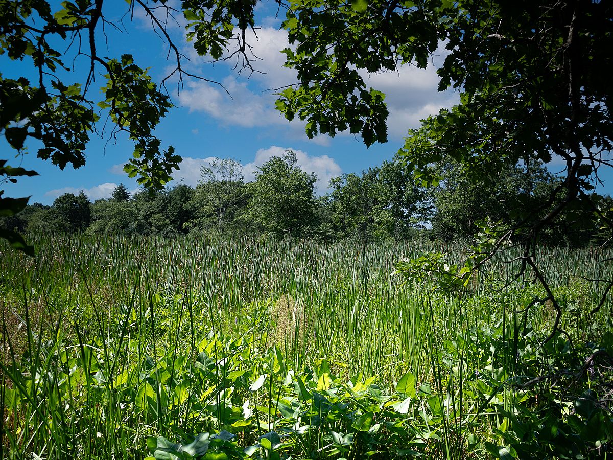 In summer, wildflowers are abundant. Upland wooded areas are dominated by red oak, red maple and white pine. Lower, wetter areas form the water supply for the Artichoke River Reservoir and include open meadows and fields with sedges, rushes and cool-season grasses.