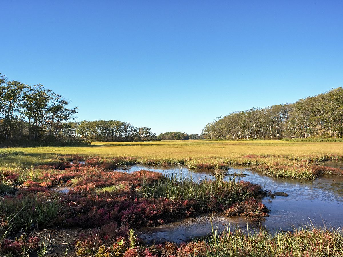 Salt marshes give way to wooded uplands with shagbark hickory, white oak, and sassafras with no two leaves the same. In September, look for the bright red blaze of Salicornia in the salt marsh.