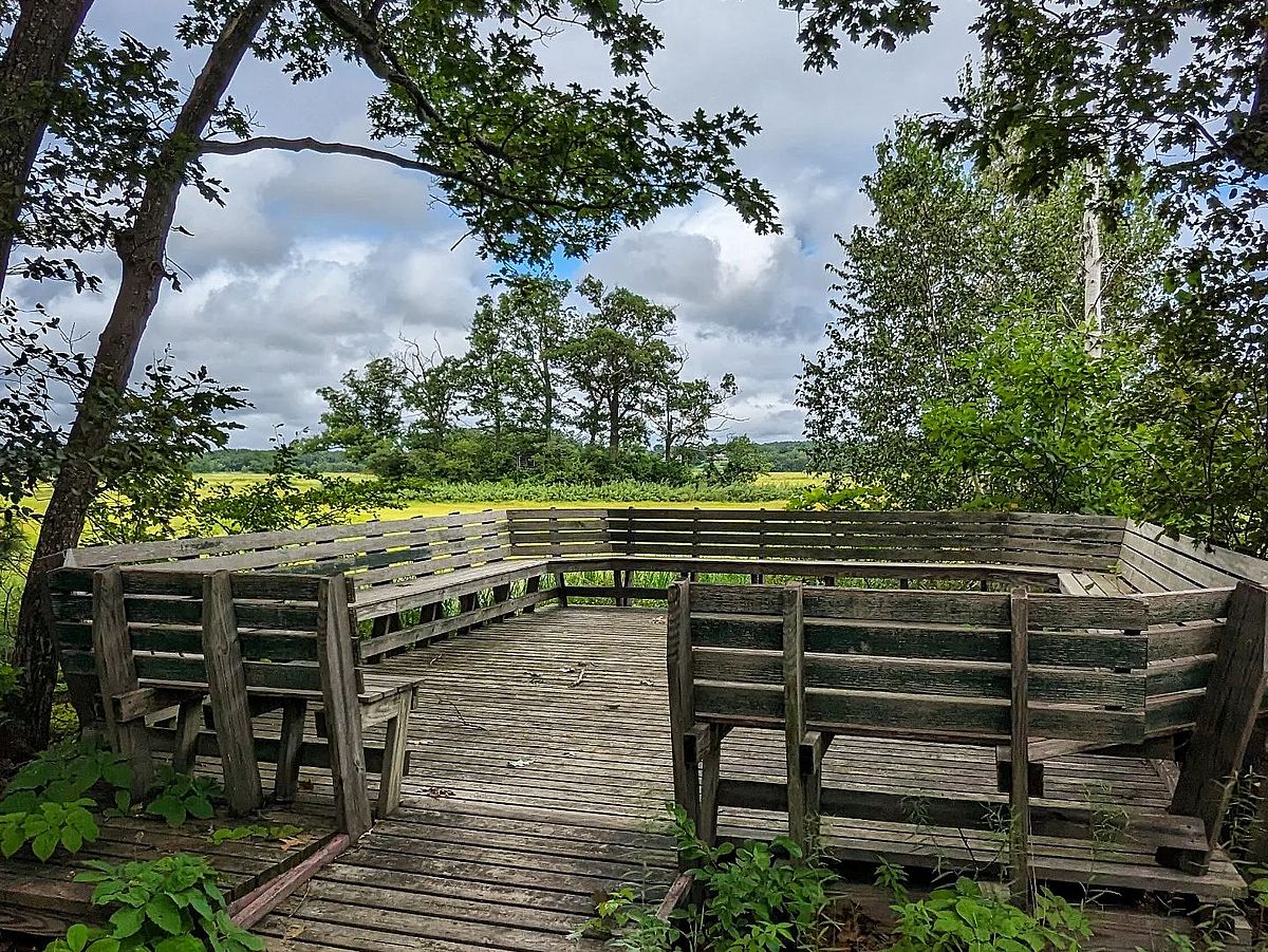 A short trail that passes through a field along the edge of a woodland and offers a view into the salt marsh.