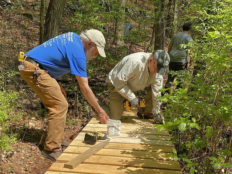 These volunteers assist with property maintenance projects, trail building, invasive species management, and more!